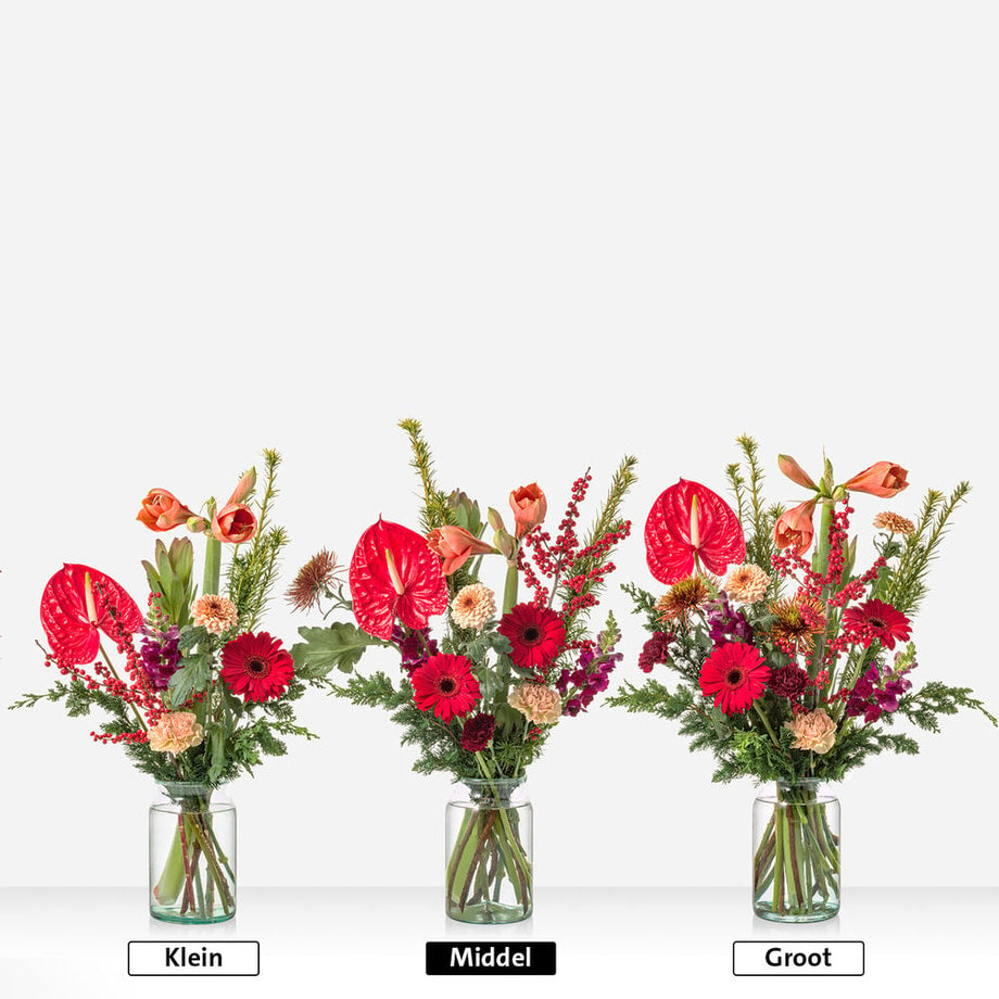 December betekent warmte, gezelligheid en volop feestvreugde, en dat zie je direct terug in dit stralende maandboeket! De vurige anthurium steelt zonder moeite de show, terwijl dieprode gerbera's en zachte perzikkleurige anjers zorgen voor een weelderige explosie van kleur. Het frisse groen van taxus en de speelse ilex-bessen maken het helemaal af. Die combinatie van warm rood, zacht oranje en romig crème? Pure decembermagie! Perfect om jezelf mee te verwennen tijdens koude winteravonden, of om iemand anders helemaal in de stemming te brengen.