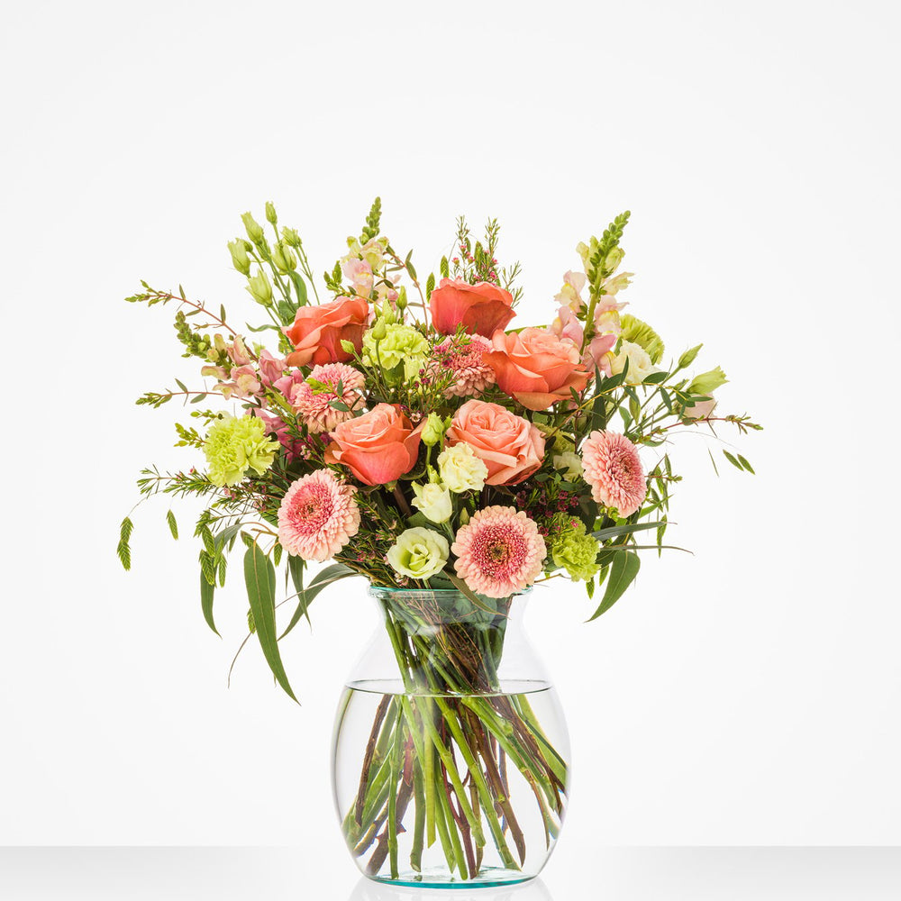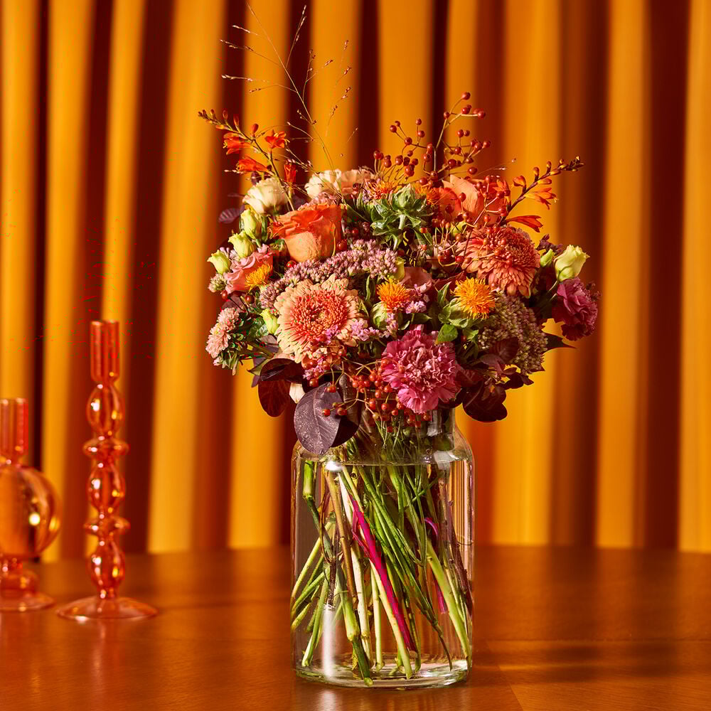 Zoete pasteltinten, aangevuld met warme herfstkleuren als koraalrood en vurig oranje en veel groen: dit Zacht najaar boeket is een plaatje om naar te kijken. Zelfs al gaat het buiten nog zo te keer en is het nog zo koud, dan nog voelt het met dit heerlijke boeketje in huis alsof het weer augustus is. Of je nu iemand wilt feliciteren, bedanken of gewoon een fijne herfst wilt wensen: met dit boeketje zit je goed.