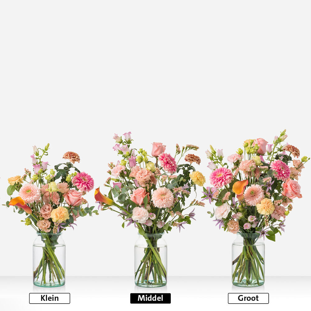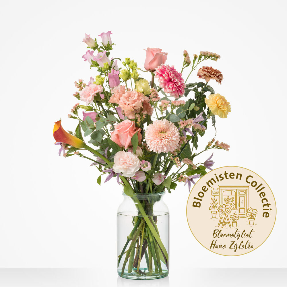 Poederzacht en oh zo mooi! Het Franka boeket is een dromerig boeket vol zachte pasteltinten dat meteen een glimlach op je gezicht tovert. Rozen, anjers en clematis in romantische roze en lila kleuren worden speels gecombineerd met weelderig groen. Het resultaat? Een boeket dat even goed in jouw eigen woonkamer staat als dat het iemand anders blij maakt. Perfect om jezelf te trakteren of om iemand te laten weten dat je aan hem of haar denkt!