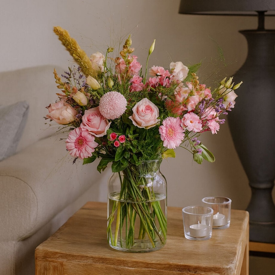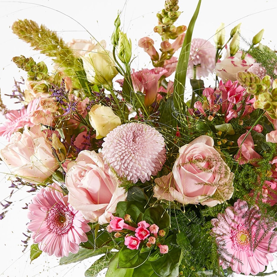 Bied troost in moeilijk tijden met dit luxe Troostboeket. Het boeket is rijkelijk geschikt met de allermooiste roze rozen, gerbera’s en dahlia’s: bloemen die bekend staan om hun troostende en liefdevolle symboliek. Door het aan te vullen met fijn bladgroen, ontstaat een luchtig en fris boeket dat de ontvanger direct een goed gevoel bezorgt. Een heel mooi boeket om te condoleren en uw medeleven te betuigen in tijden van tegenslag.