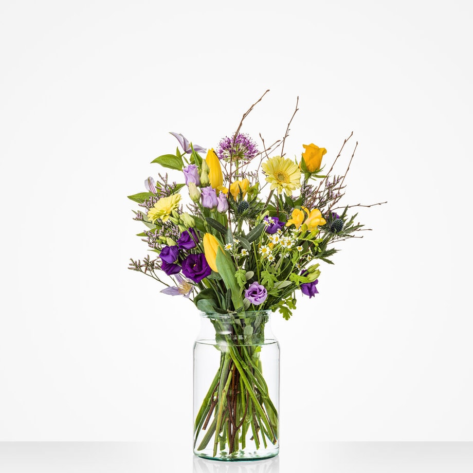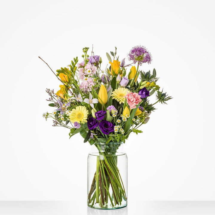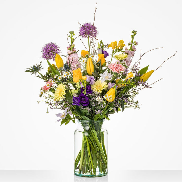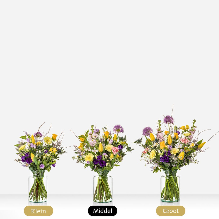 Fijne Paasdagen gegarandeerd met dit vrolijke boeket in lila, roze en paarstinten. Een absolute favoriet voor een vrolijk Pasen. Het perfecte boeket voor op de brunchtafel of als cadeautje voor de gastheer of -vrouw. Tip: bestel een bijpassende vaas toe en maak de verrassing compleet. Wie wens jij fijne Paasdagen?