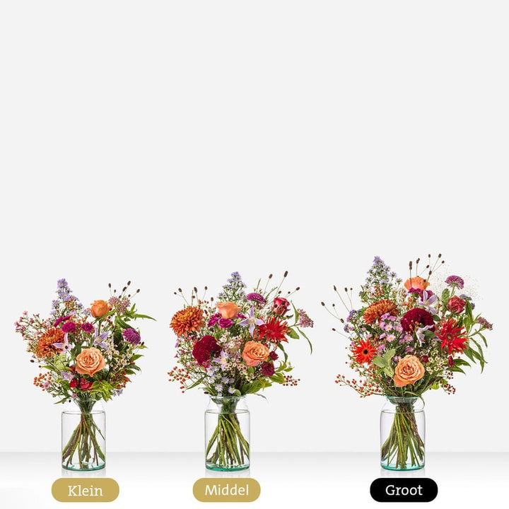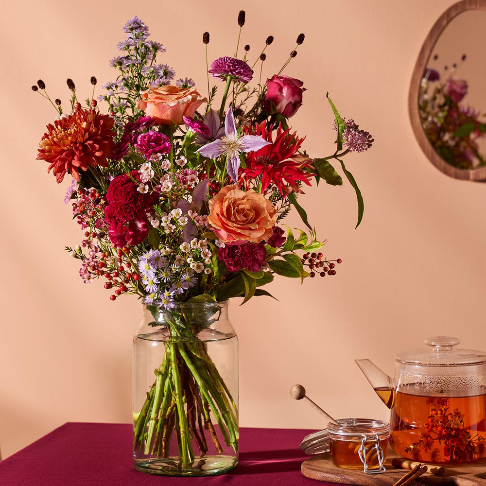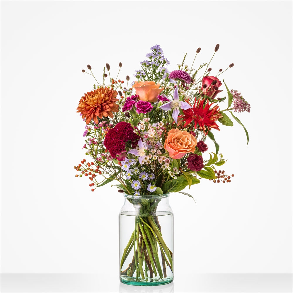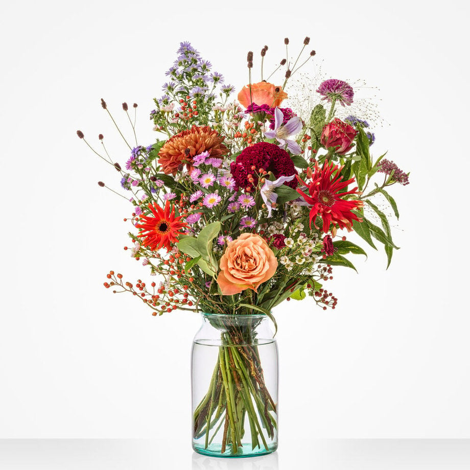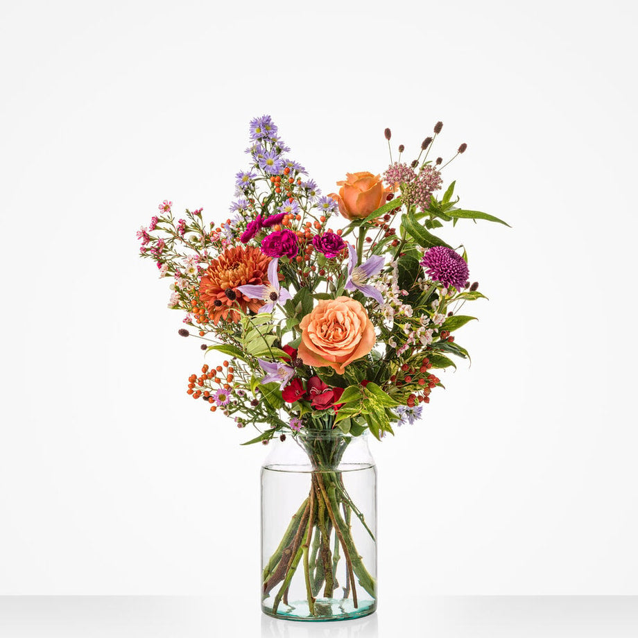Bezorg iemand een prachtige herfst met dit Herfstpracht boeket. Hoe hard de temperaturen buiten ook naar beneden gaan, met een bos als dit op tafel is het binnen altijd warm. Het boeket is zeer rijk opgemaakt met een veelheid van chrysanten in combinatie met de mooiste gerbera’s, zijdeplant en limonium. De tinten zacht lila, dieprood en oranje in combinatie met het groen geven een prachtige warme gloed af, waarvan je hart spontaan in vuur en vlam vliegt.