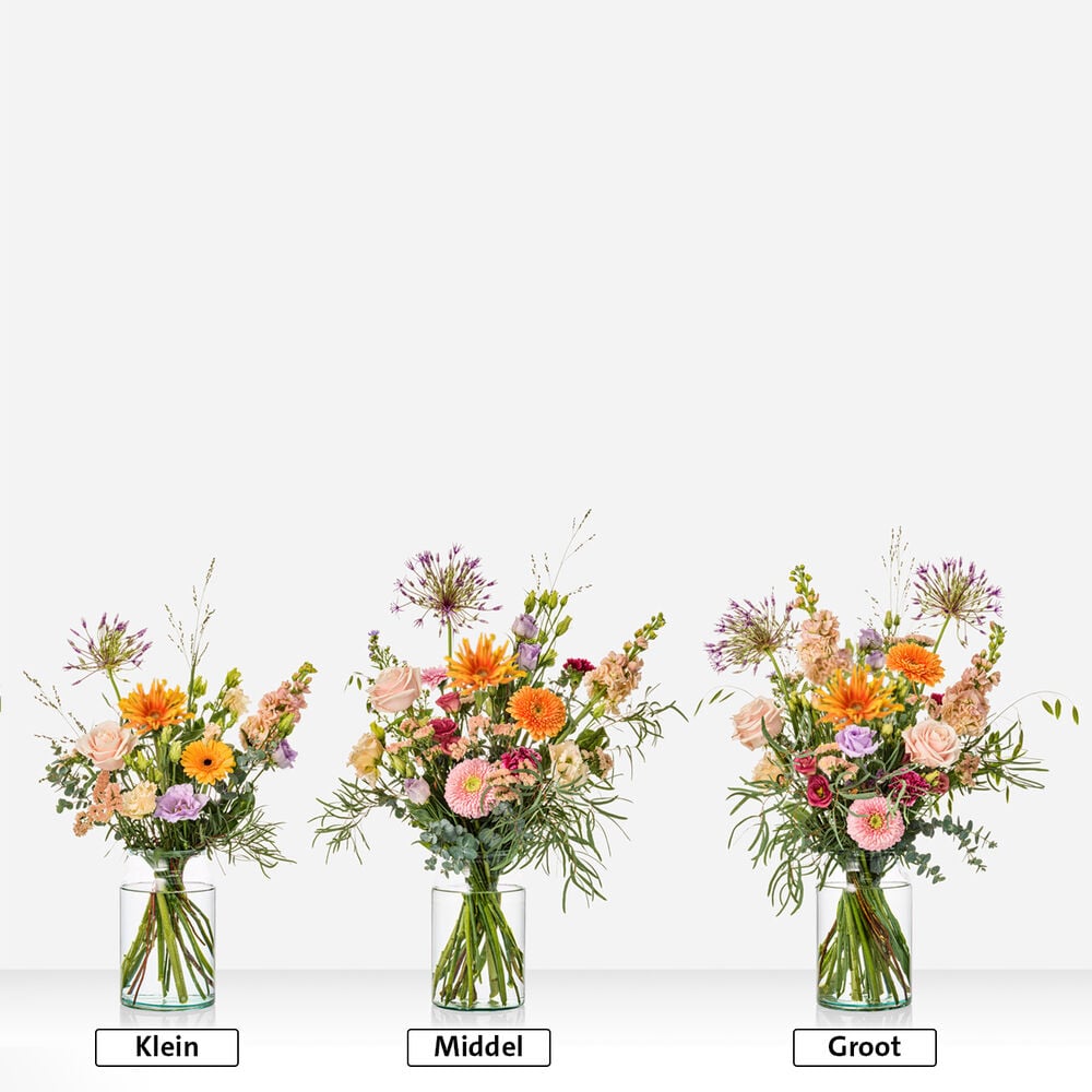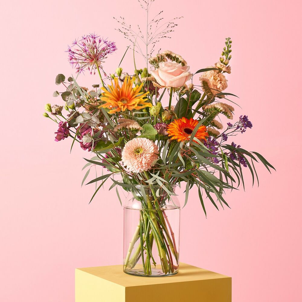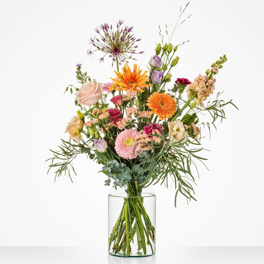 Wat een heerlijk bosje bloemen is dit ook weer! En niet zomaar: dit Kleurgeluk boeket doet precies wat de naam belooft, want je bezorgt er een kleurrijk geheel van geluksmomenten in bloemvorm mee. Kijk toch eens hoe die uitbundige paarse allium als een vuurwerk boven alles uittorent, terwijl de vurige oranje gerbera's en die zachte roze chrysant er gewoon omheen staan te kijken – en staan te stralen! En dan dat speelse groen: het danst er speels tussendoor alsof het precies weet hoe het de show moet stelen zonder dat het opvalt. Wil jij dus instant geluk bezorgen? Dan is dit kleurrijke arrangement jouw boeket!