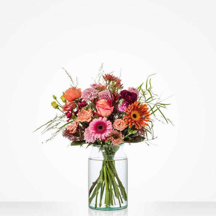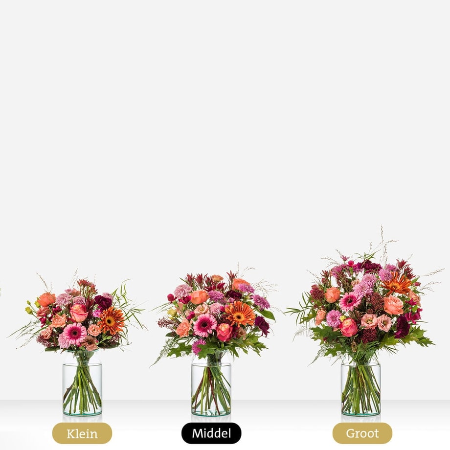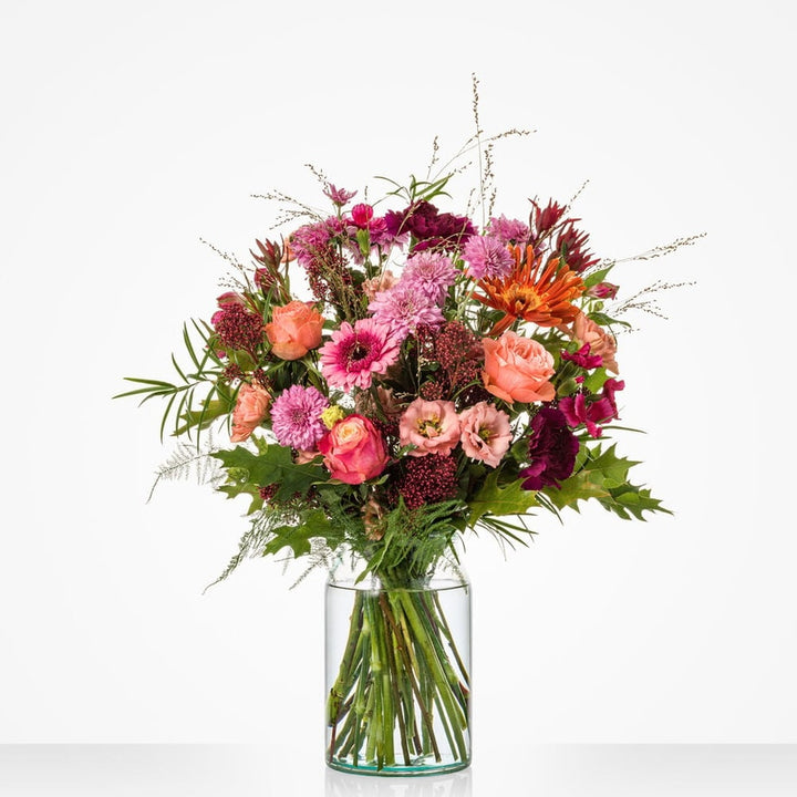 Nu de dagen steeds korter worden en de temperaturen steeds lager, kunnen veel mensen wel wat liefde gebruiken. Gun iemand daarom een bosje liefde met dit prachtige Liefdevol najaar boeket. Het boeket is klassiek rond opgemaakt als een echte biedermeier. De vele gerbera’s in combinatie met enkele rozen, nerine en veel bladgroen in tinten als paars, roze en oranje stralen enorm veel warmte en liefde uit. Wie gun jij zo’n liefdevolle verrassing?