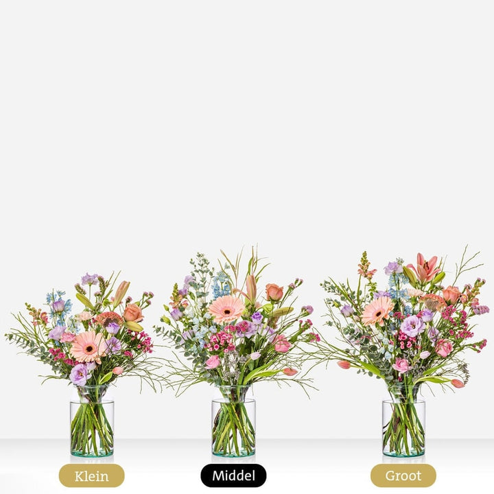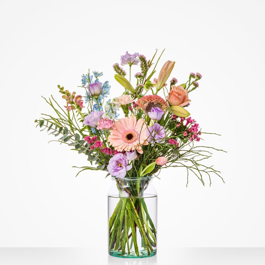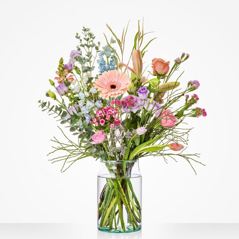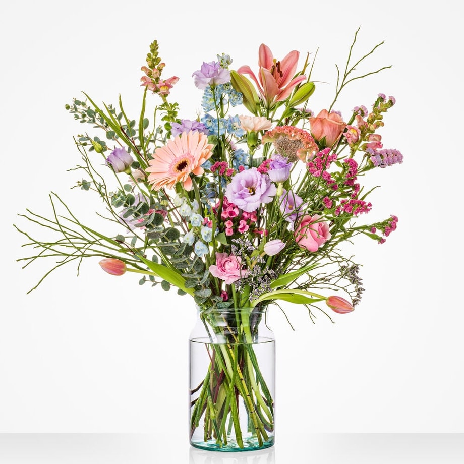 Lief, liever, verliefd! Geef dit boeket aan de liefste persoon die jij kent en je zet ongetwijfeld zijn of haar hart in vuur en vlam. Het liever verliefd boeket wordt met veel zorg samengesteld met een weelderige combinatie van gerbera’s, lisianthussen en roosjes in zachte pasteltinten. Een favoriet op Valentijnsdag, maar niet minder geliefd op alle andere dagen van het jaar!