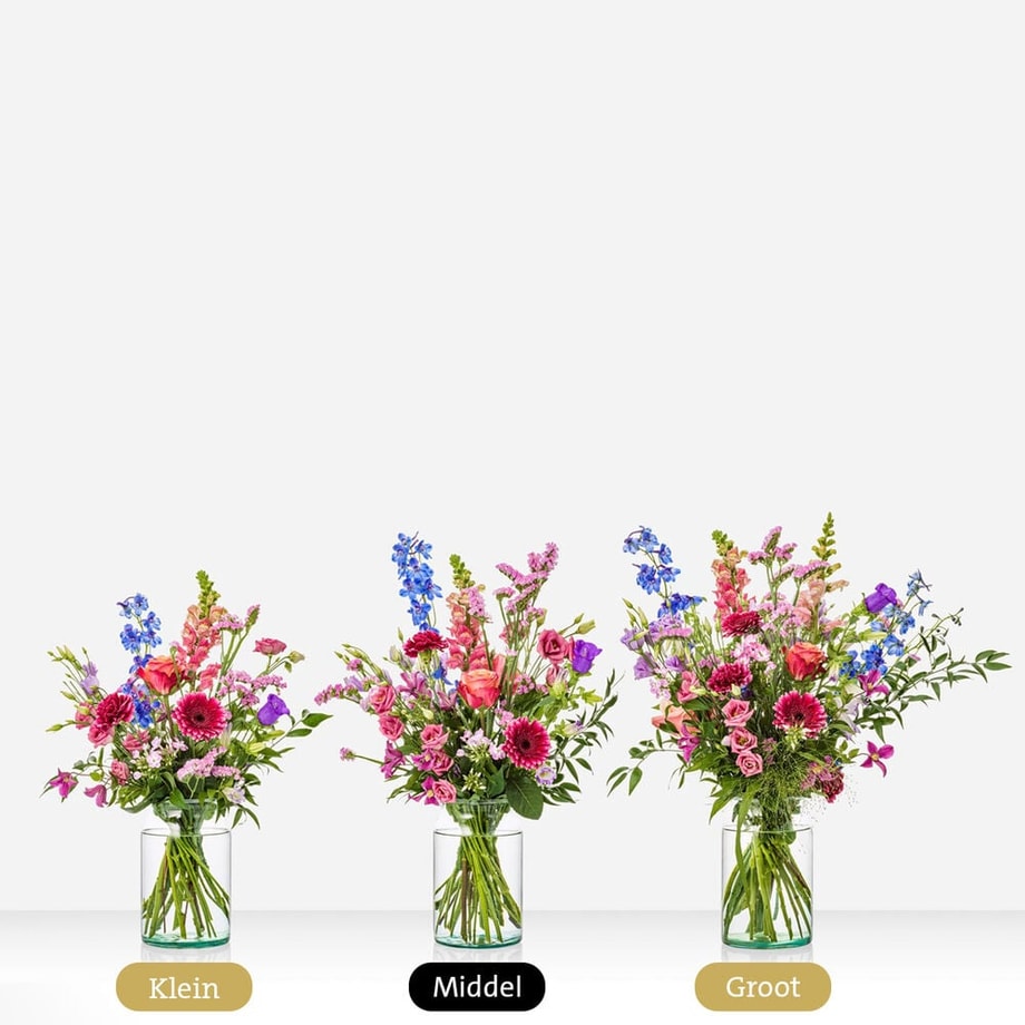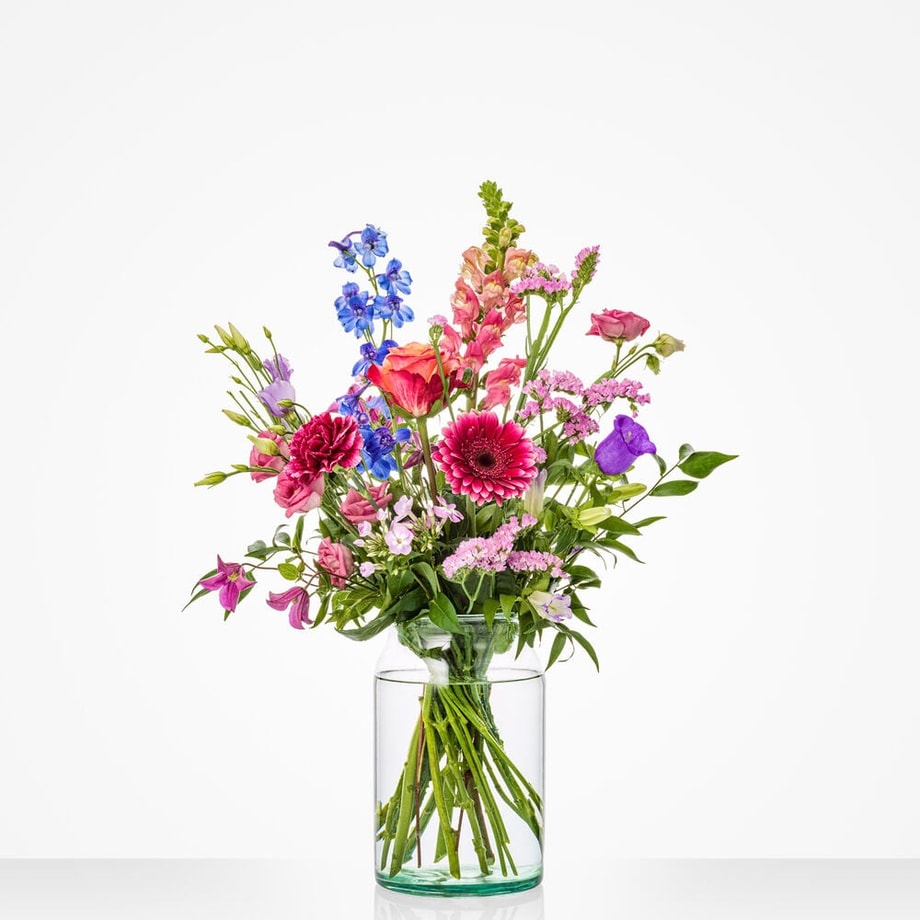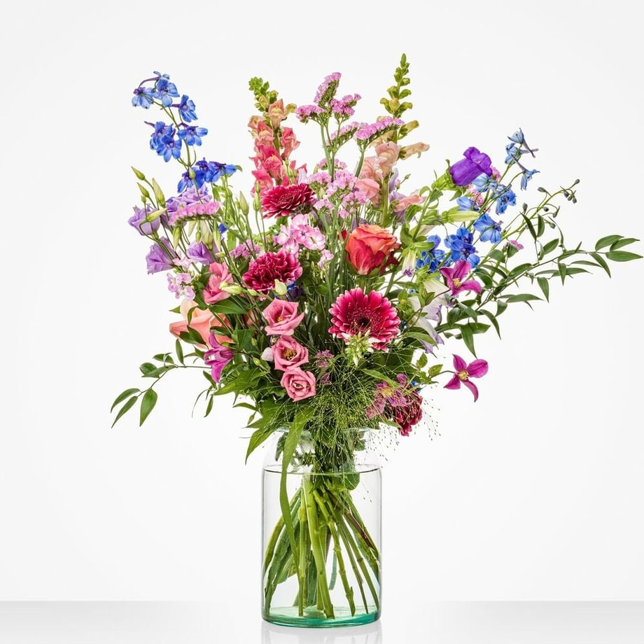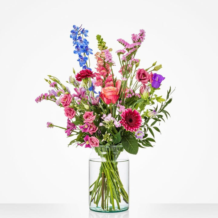 De lente staat voor de deur, en dat zie je terug in dit sprankelende maandboeket! Het sierlijke ridderspoor rijst majestueus boven het geheel uit, terwijl dieproze gerbera's en een mix van roze en oranje rozen voor een warme gloed zorgen. De luchtige statice en het royale bladgroen maken het plaatje helemaal af en geven het boeket een speelse touch. Of je nu jezelf wilt verwennen of iemand anders blij wilt maken: het Maandboeket februari brengt gegarandeerd een vleugje voorjaar in huis. Bij wie mogen wij uit jouw naam het voorjaar voor de deur zetten?