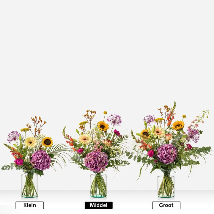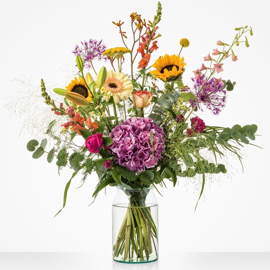 Met een zwoele zucht blaast juni ons zo de zomer in. Het Maandboeket juni symboliseert deze natuurlijke overgang naar het zomerseizoen. Het bloemstuk is speels en levendig geschikt met prachtige zomerbloemen als de hortensia en zonnebloem, aangevuld met roze roos en gerbera. Het geheel oogt hierdoor ontzettend natuurlijk en wild, waardoor het je echt een zomergevoel geeft. Wie gun jij dit bijzondere gevoel?