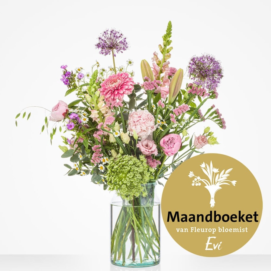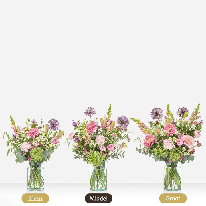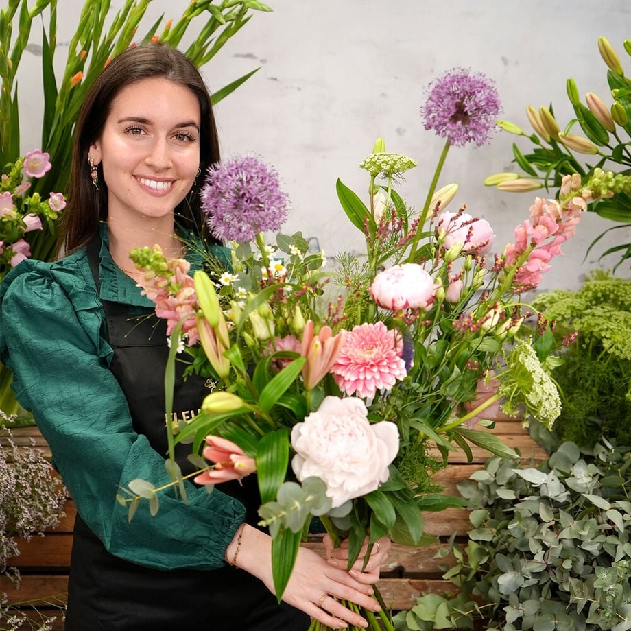 Wie mei zegt, zegt voorjaar, ontluikende natuur, Moederdag en natuurlijk: pioenroos! In dit boeket, waarin zachte roze pasteltinten de boventoon voeren, staat de majestueuze pioen dan ook centraal. Door de pioenrozen te combineren met speelse allium, leeuwenbek en dille, ontstaat een vrolijk, liefdevol en licht springerig geheel. Wat ons betreft een boeket dat heel de maand mei op tafel mag staan!