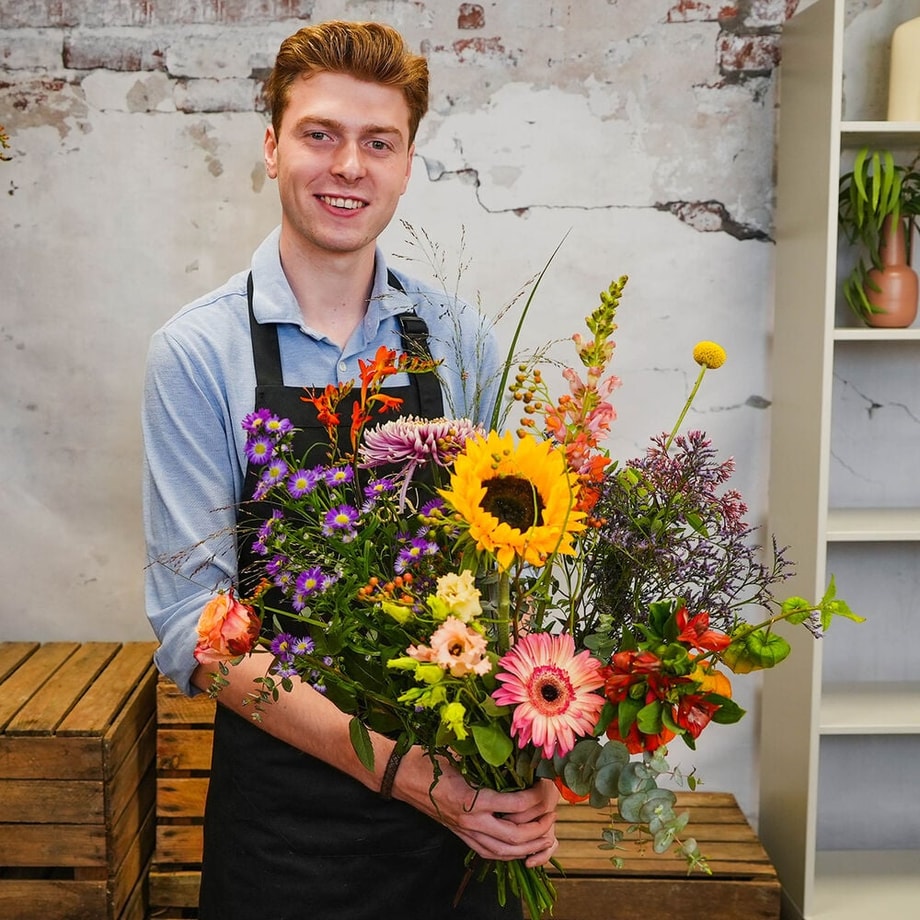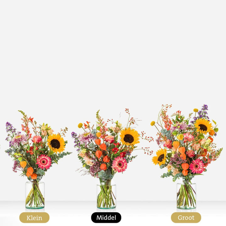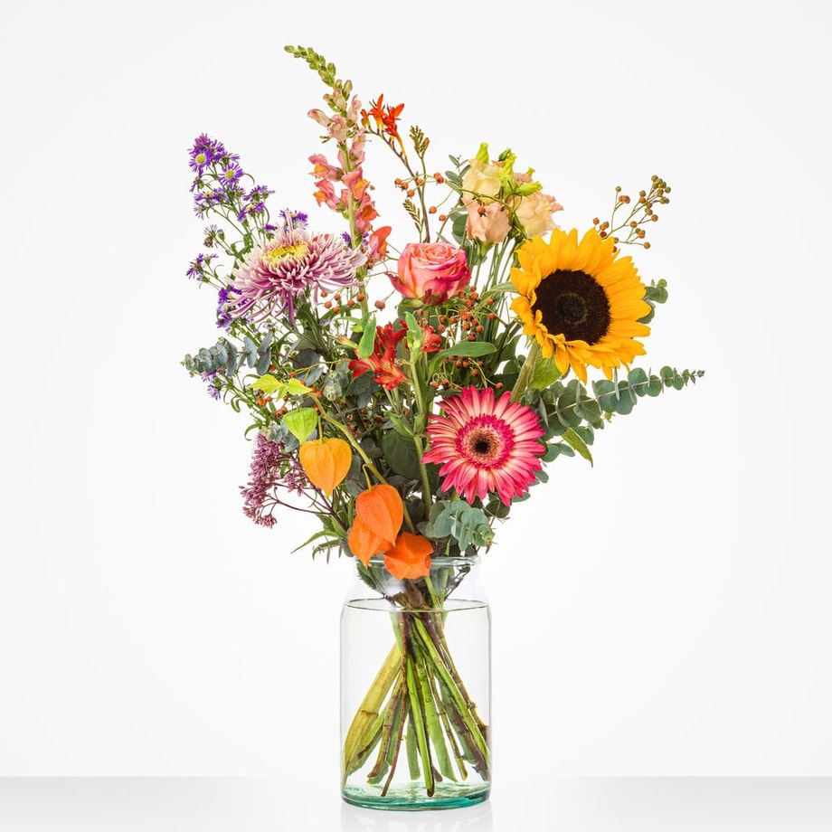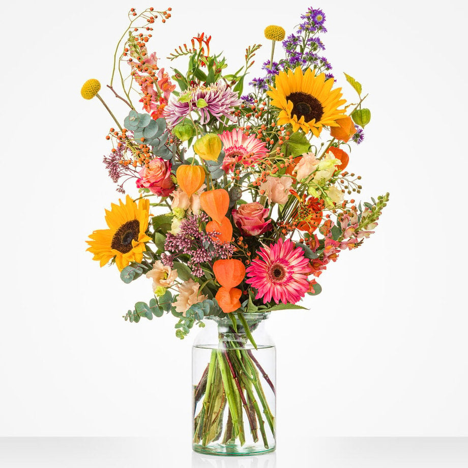 Hoe korter de dagen worden, hoe meer dit Maandboeket zal stralen. Nu vormen boeketten met zonnebloemen al gauw het stralende middelpunt van je vaas, maar door de toevoeging van speelse physalis lampions, kleurrijke rozen, een uitbundige vuur-roze gerbera en blauwe chrysantjes is dit een boeket waar je niet omheen kunt deze tijd van het jaar. Bij wie mogen we dit exclusieve boeket voor jou bezorgen?