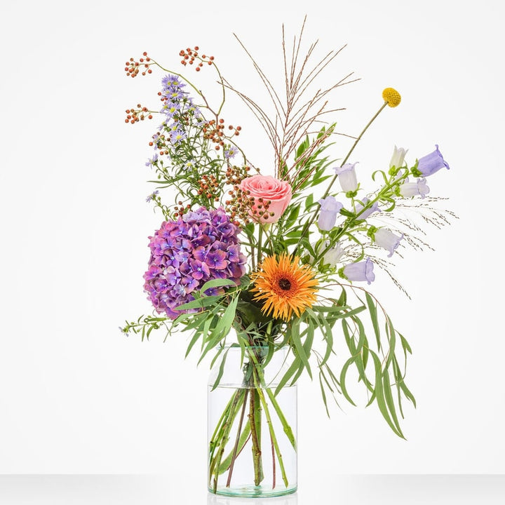 Bloemist Dirma maakt de maand september extra kleurrijk met dit prachtige boeket. Met liefde samengesteld met de mooiste bloemen van dit seizoen: de Hortensia, Aster en Rozenbottel. Om verliefd op te worden, zo mooi.