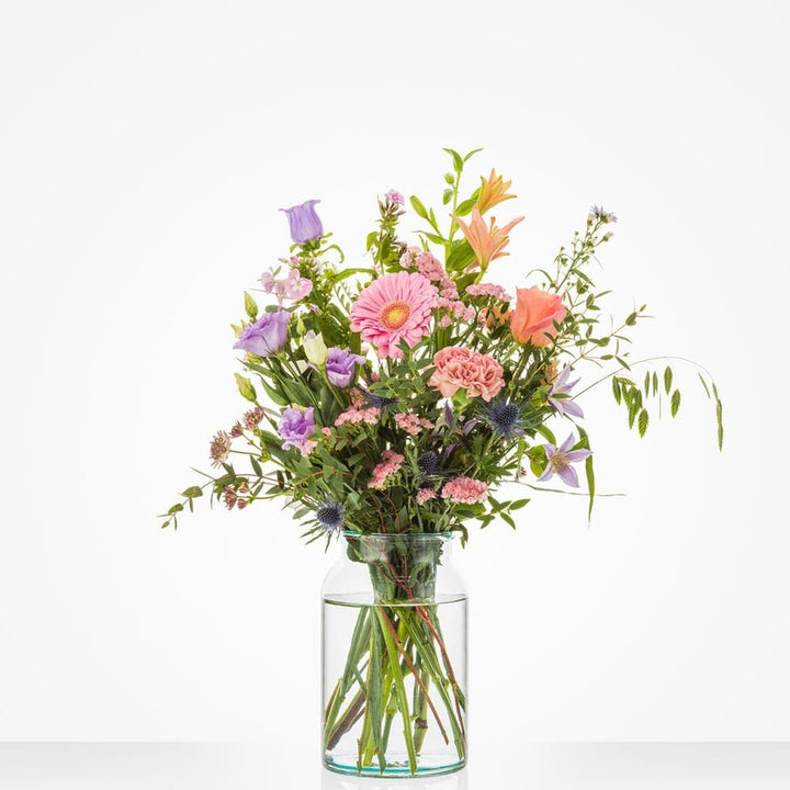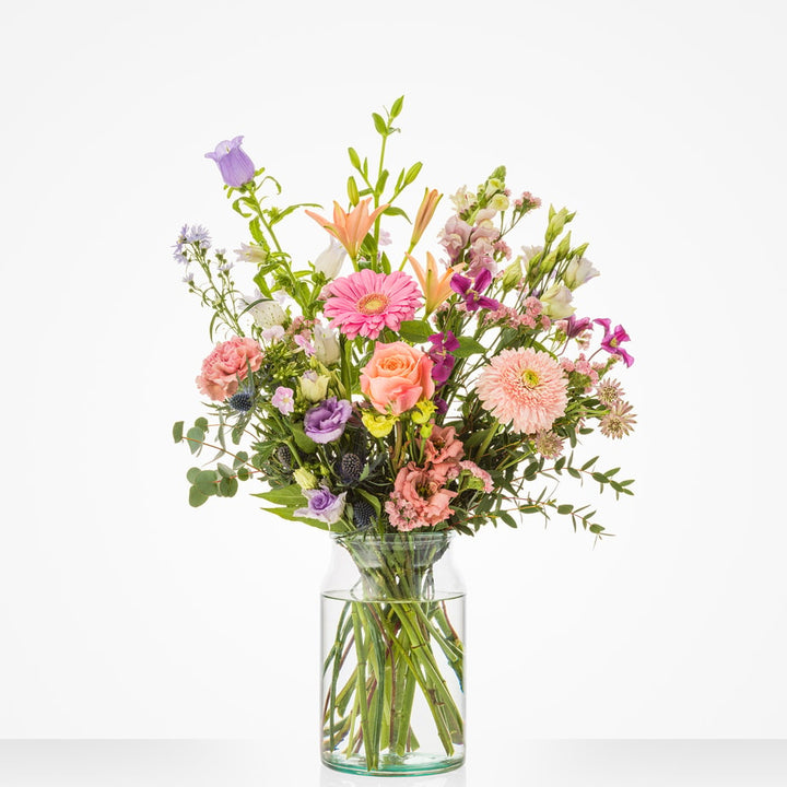Wat een heerlijk plukboeket is dit zeg! Een lieflijke compositie van rozen, gerbera’s en delphinium in prachtig zomerse pastelkleuren. Dankzij de speelse schikking lijkt het alsof de bloemetjes zo van de hei zijn geplukt, maar vergis je niet: dit boeket is eersteklas vakwerk. Het pastel geplukt boeket is mee heel veel zorg samengesteld met de mooiste dagverse veilingbloemen. Wie mogen we uit jouw naam verrassen met dit heerlijke plukboeketje?