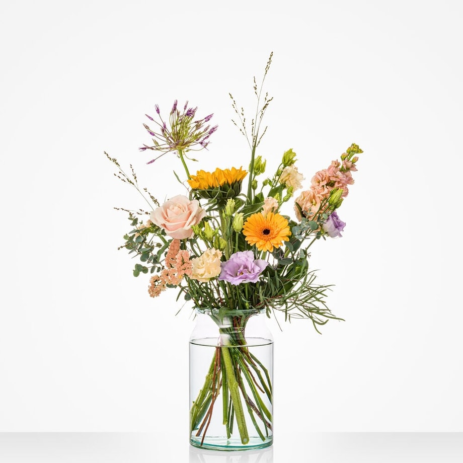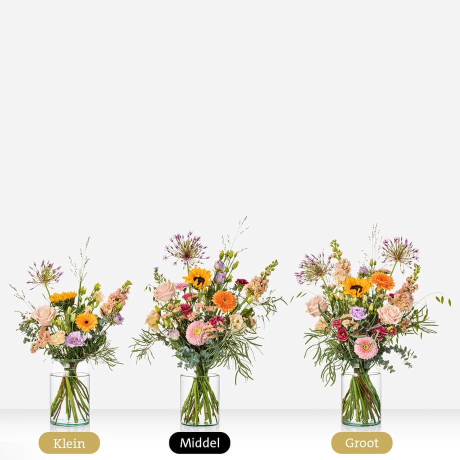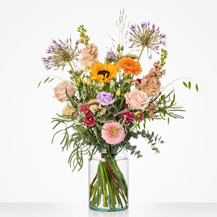 Feestjes in de zomer zijn altijd het allerleukst. Het zonnetje schijnt, lekker temperatuurtje, geen gedoe met warme jassen en heerlijk genieten tijdens zo’n lange zwoele avond. Dit Pastelfeestje boeket ademt in alles zomerfeestjes. Sierlijk opgemaakt met de mooiste zomerbloeiers als zonnebloemen en delphinium en aangevuld met gerbera’s en rozen in fluweelzachte pasteltinten, is dit een boeket waar je geen genoeg van zult krijgen. Of je nu je zomerfeestje lekker zomers aan wilt kleden of iemand wilt verrassen met een prachtig pastelkleurig feestje in een vaas: met dit boeket zit je altijd goed.
