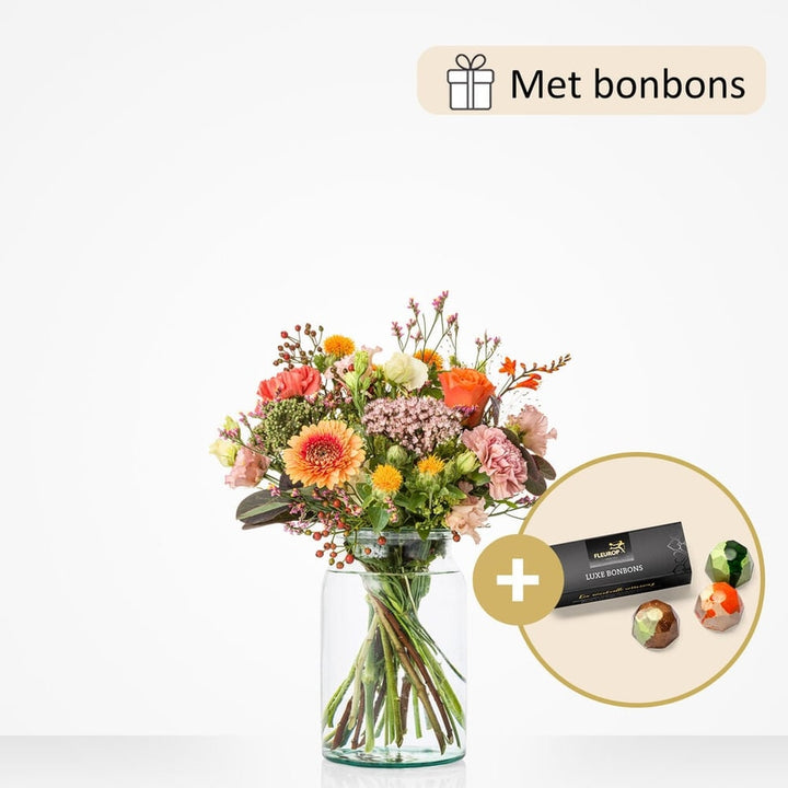 Iemand zuiver laten genieten? Dan is dit Pure verwennerij boeket een droom van een cadeau. Het boeket is rijkelijk opgemaakt met de mooiste bloemen als rozen, dahlia’s en chrysanten in zachte herfsttinten als roze, koraalrood en vurig oranje.  En dat is nog niet alles, want de gelukkige ontvanger van dit boeket krijgt er ook een doosje met de allerlekkerste bonbons bij. Deze bonbons zijn gevuld met een zijdezachte pralinévulling in fantastische smaken als hazelnoot, pistache en amandel. Echt pure verwennerij!