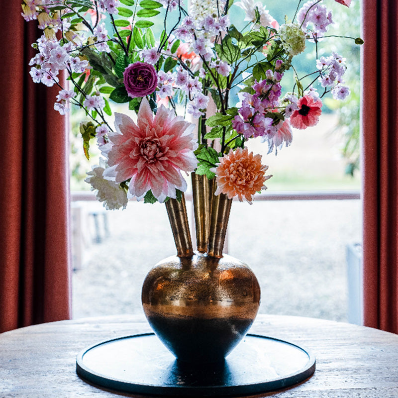 Deze mooie vaas heeft 3 openingen die ieder te vullen zijn met (zijden) bloemen. Door het robuuste formaat van 46 cm bij 30 cm is het een echte eyecatcher voor op tafel!