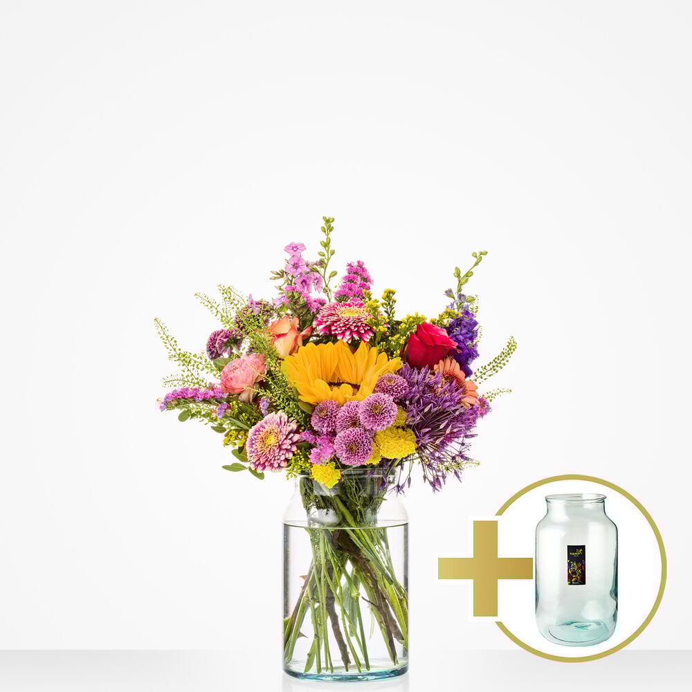 Instant geluk gegarandeerd met dit prachtige zomerboeket inclusief bijpassende vaas! Dit boeket is het perfecte cadeau voor jezelf of iemand dierbaar. In het boeket zijn verschillende soorten en kleuren bloemen te vinden die elkaar op een fleurige manier versterken. Wij bieden dit boeket in drie formaten aan, exclusief vaas.