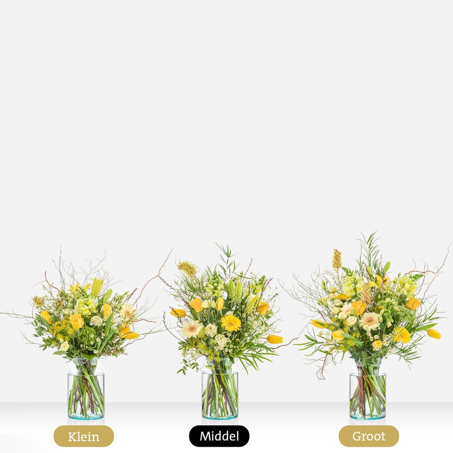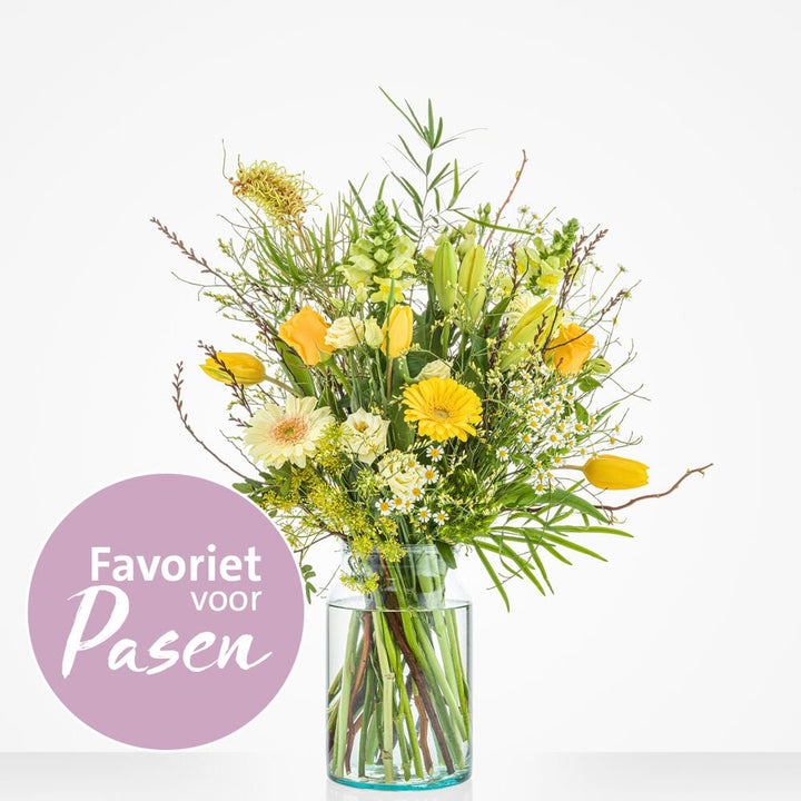 Geniet van de paasdagen met dit vrolijke paasboeket bestaande uit een combinatie van witte en gele bloemen. Exclusief vaas.