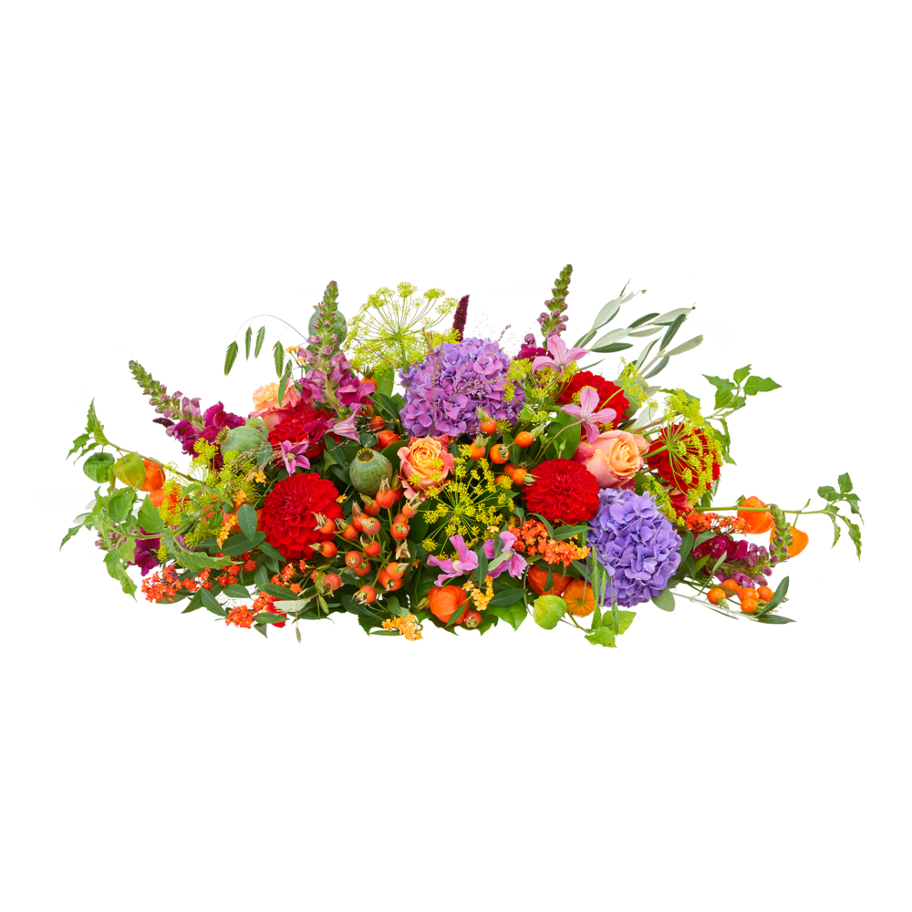 Het ovale bloemstuk 'Warme weelde' is een compact en modern kleurrijk bloemstuk. Verkrijgbaar in 60 cm, 80 cm of 100 cm.