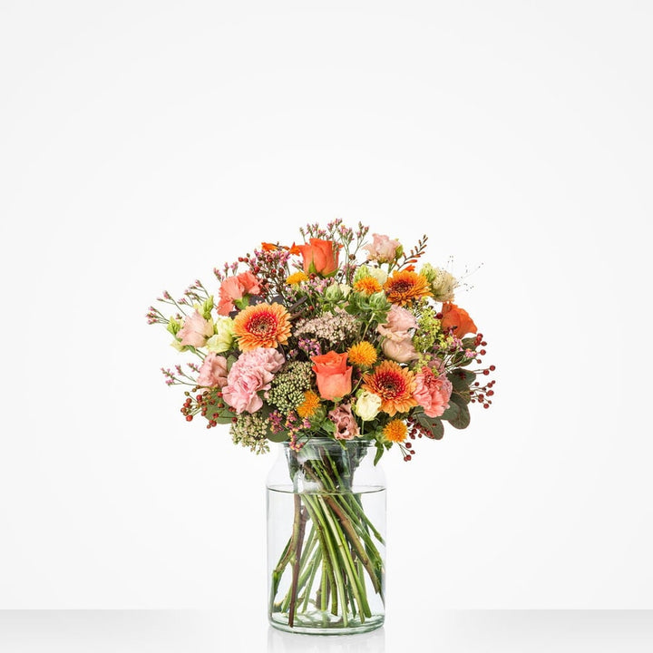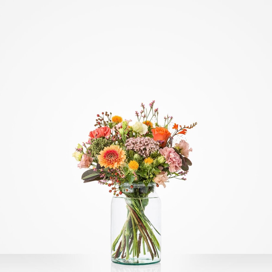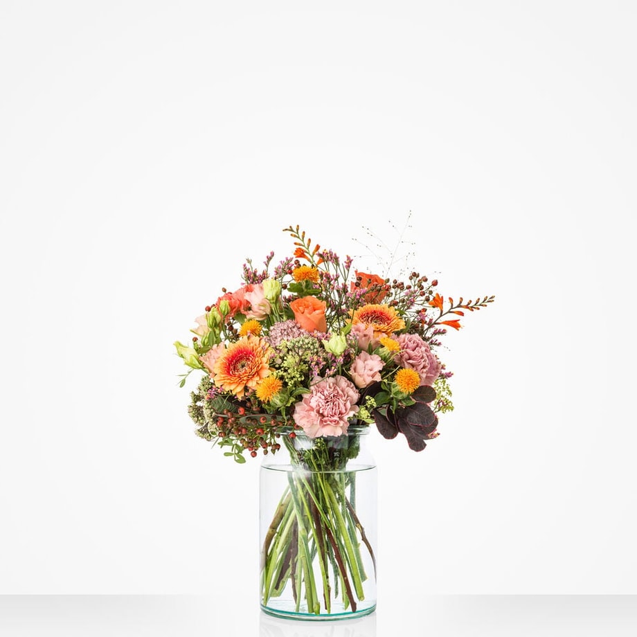 Zoete pasteltinten, aangevuld met warme herfstkleuren als koraalrood en vurig oranje en veel groen: dit Zacht najaar boeket is een plaatje om naar te kijken. Zelfs al gaat het buiten nog zo te keer en is het nog zo koud, dan nog voelt het met dit heerlijke boeketje in huis alsof het weer augustus is. Of je nu iemand wilt feliciteren, bedanken of gewoon een fijne herfst wilt wensen: met dit boeketje zit je goed.
